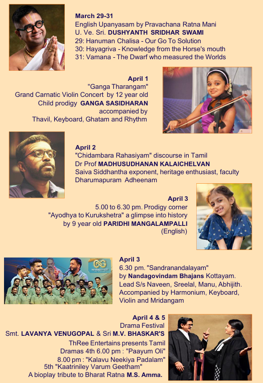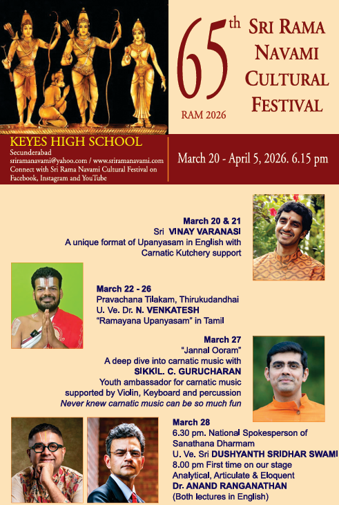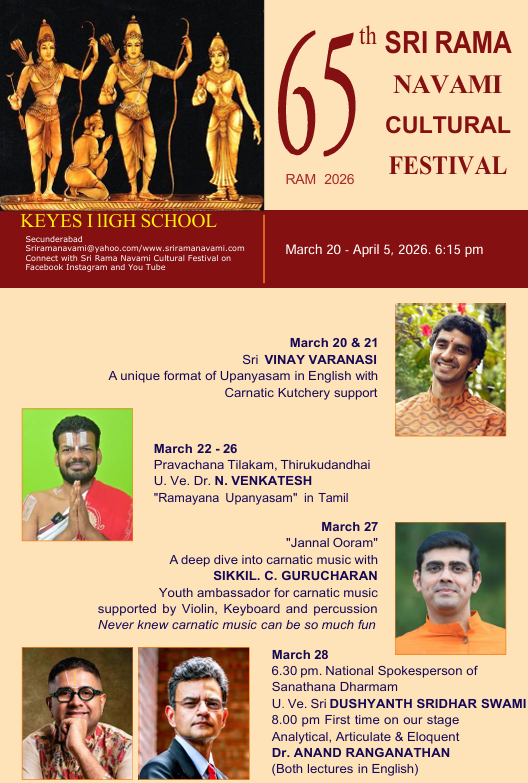 Sri Rama Navami Cultural Festival has a unique place in the cultural horizon of the twin cities. It may not be an exaggeration if we say that this is the only platform for Upanyasams and Tamil Literary Discourses in the twin cities. The annual programmes conducted around Sri Rama Navami time include cultural programmes, Iyal-Isai-Nadagam, with an occasional dash of folklore.